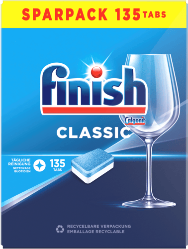 • Finish Classic er et højeffektivt opvaskemiddel i praktiske tabs. Hver pakke indeholder 135 tabs, der effektivt fjerner madrester og snavs fra dit service, og efterlader dine glas og tallerkener skinnende rene. Finish Powerball Classic er nemme at bruge - det er bare at placere en tab i din opvaskemaskine, og så tage sig af resten. Vægt: 1.1 kg.